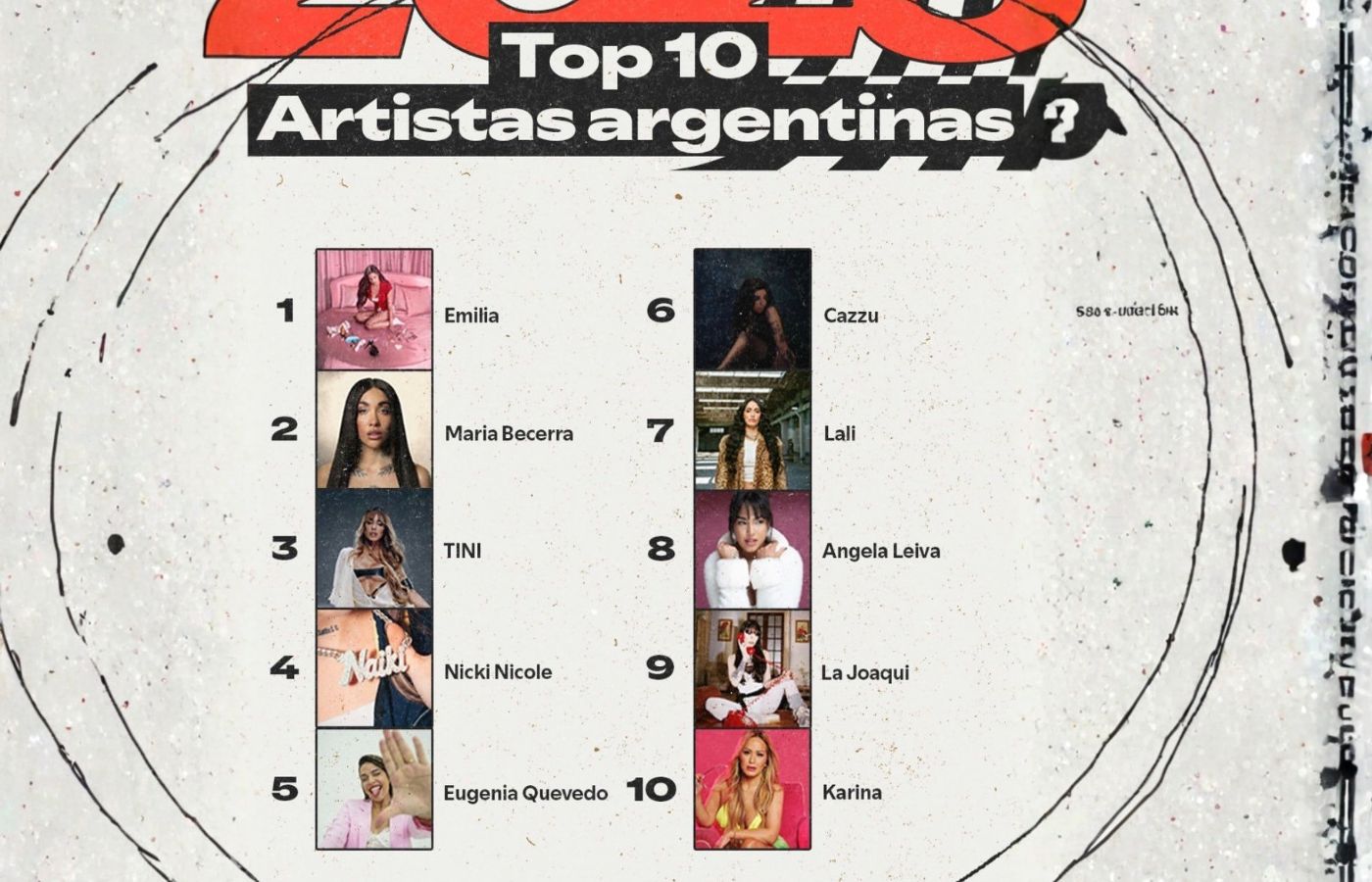 En el TOP también entraron artistas como La Joaqui en el puesto n.º 9 y Karina “La princesita” en el puesto n.º 10 coronando así un excelente año para las artistas femeninas de la industria musical.